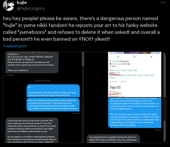 El pasado 7 de Enero de 2025, el usuario Hujle, dueño de la página, hizo un post vía Twitter en el cual en un tono burlesco mostraba una conversación que había tenido con otro usuario llamado Mocha al privado. En dicha conversación, el artista le pedía a Hujle la eliminación de todo su arte que se encontraba subido al sitio porque no le gustaba que la gente reposteara su arte en otros sitios.