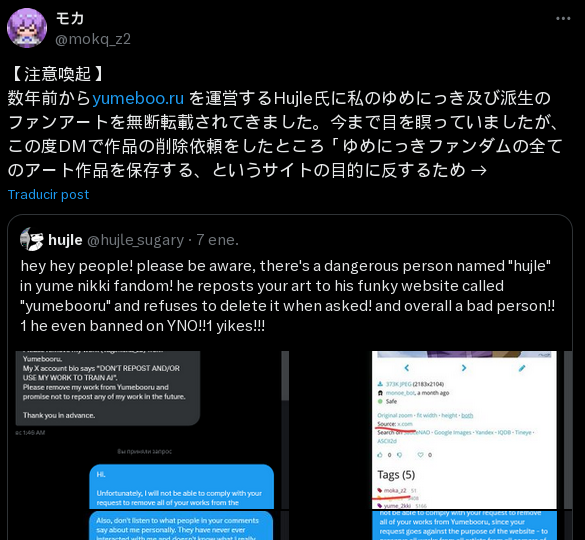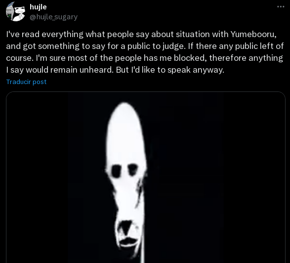 Finalmente y a raíz de todo el ruido que hubo entorno a Yumebooru, Hujle hizo un hilo hablando sobre la situación. Entre las cosas sobre las que habló se encuentra que todo mundo debería entender que las personas pierden control sobre las cosas que comparten por Internet. También mencionó que la intención de Yumebooru no era la de dañar a los artistas, sino de preservar su arte en caso de que sea borrado de un día para otro, como ya le había tocado ver.
