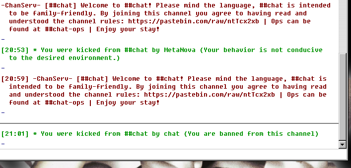La verdad, me causó algo de risa lo tan absurdo de la situación, más si tomamos en cuenta de que la mayoría de personas que usan IRC son gente vieja o nerds de computadora, por lo que ya me puedo imaginar al tipo como un moderador de Reddit en caso de que todo lo que haya hecho haya ido en serio, ¡ja ja ja!