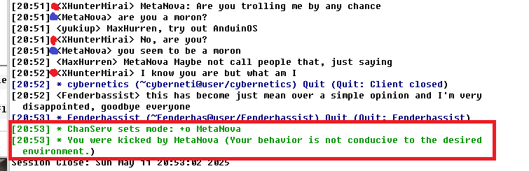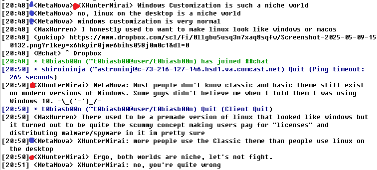 En la entrada de hoy, me gustaría relatar un hecho que me acaba de ocurrir el día de hoy 11 de mayo de 2025 mientras trataba de probar IRC nuevamente después de un tiempo. Pasa que, al parecer mi ISP de mi casa en mi ciudad no se lleva muy bien con IRC que digamos, así que quise ver si con el de esta otra casa, que es uno distinto y con más libertades, funcionaba mejor de casualidad. (Spoiler: Si lo hizo).