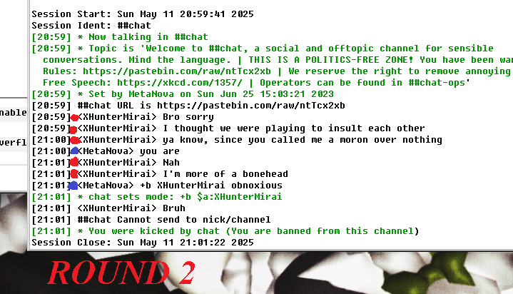 Y de esta forma es que tuve mi primera pelea con alguien en IRC y fui baneado del canal más interesante de Libera. Tal parece que ya no voy a poder disfrutar tanto de este viejo pero aún útil perro llamado IRC, ¿eh?